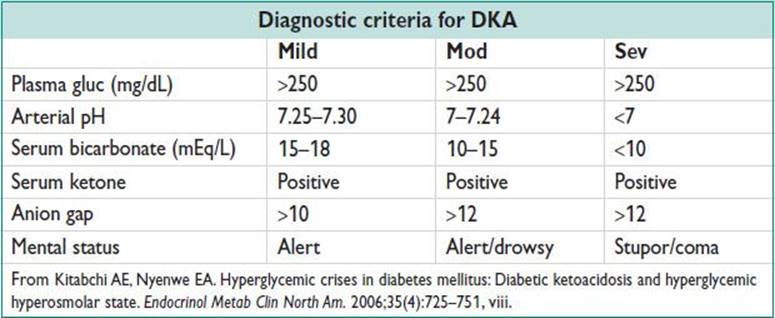 • Plasma gluc level of ≥600 mg/dL, serum osmolality of ≥320 mOsm/kg, ↑ serum urea nitrogen (BUN): Cr ratio, pH >7.3, small ketonuria, absent to low ketonemia, bicarbonate >15 mEq/L