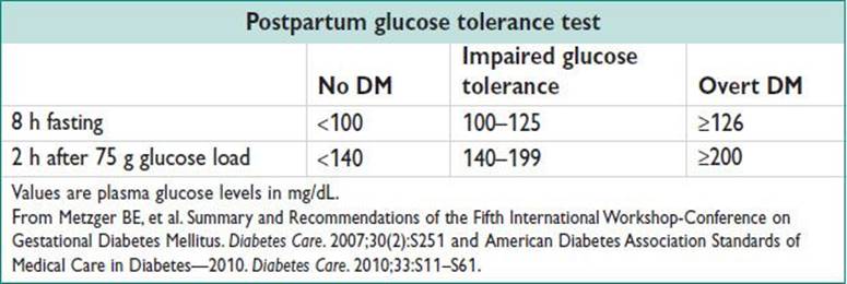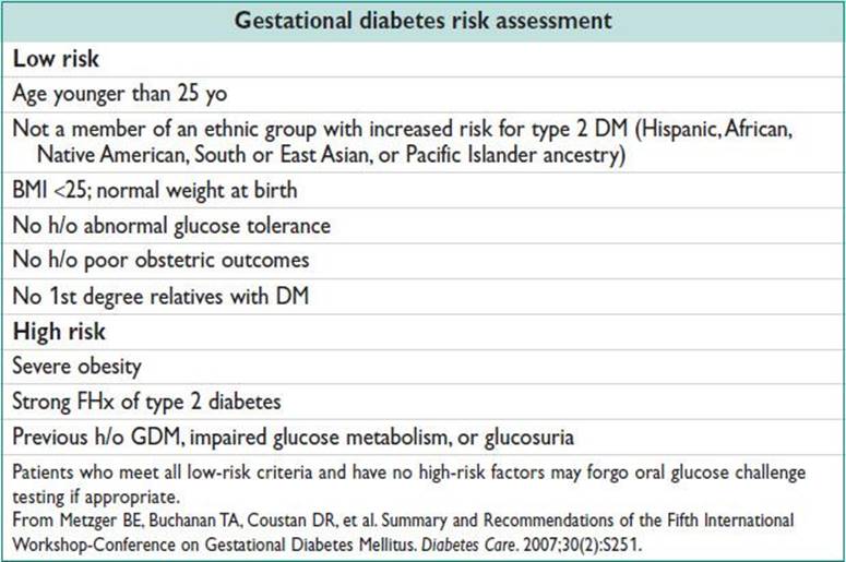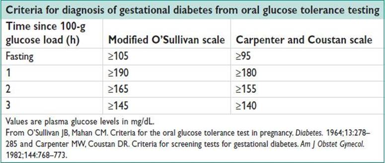• On 50 g oral gluc challenge test, serum gluc ≥140 mg/dL identifies 80% GDM; ≥130 mg/dL identifies 90% GDM. Serum gluc ≥200 mg/dL → GDM w/o other testing. Positive screening test → 3 h fasting gluc challenge (100 g test; diagnostic table, below).