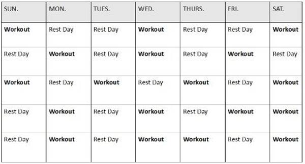 During week 1, take at least two days off between workouts. By week 2, move up to exercising every other day as long as you feel comfortable doing so. By week 3, you can move up to exercising four days a week as long as you have healthy body clues.
