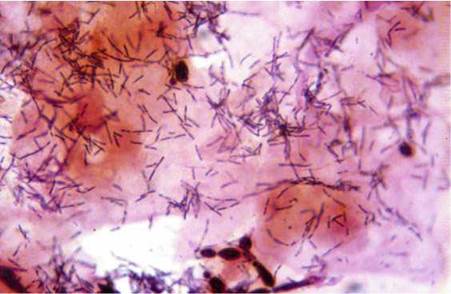 Figure 5.4. Gram stain of vaginal discharge due to candidiasis showing spores and pseudo-hyphae (lactobacilli also present)