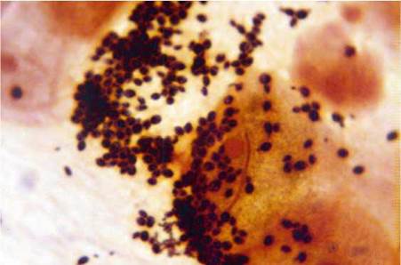 Figure 5.6. Gram stain of vaginal discharge due to Candida glabrata showing multiple spores without hyphae