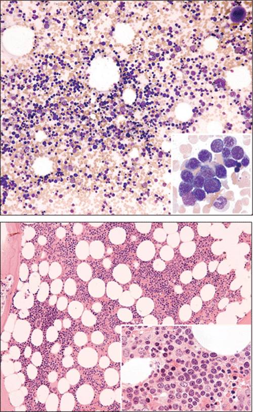 Figure 1.43 Bone marrow findings in hemolytic anemia. Top panel: Erythroid hyperplasia is present with a predominance of erythroid precursors. The normal myeloid to erythroid ratio in a bone marrow aspirate is 3 to 5:1. In this case, there occurs a reversal of the myeloid to erythroid ratio of 1:4. A similar picture occurs in acute hemorrhage. Occasional mild dysplastic erythroid precursors may be presenting these cases. Bottom panel: Bone marrow biopsy in a patient with hemolytic anemia. Erythroid hyperplasia is seen with a predominance of erythroid precursors. |