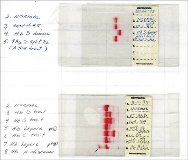 Figure 1.16 Alkaline hemoglobin (Hb) electrophoresis. Top panel: Lane 2: Normal. Lanes 3 and 5: β-thalassemia trait. Lane 4: HbS disease. Bottom panel: Lane 2: Normal. Lane 3: Hb D trait. Lane 4: HbS trait. Lanes 5 and 7: Hb Lepore trait (faint band around HbS band area). Lane 6: HbC trait. Lane 8: HbH disease (note fast-moving Hb band, arrow). Hemoglobins that move with HbS on alkaline include D/G/Lepore, and hemoglobins that move with HbC on alkaline include E/O/A2. |