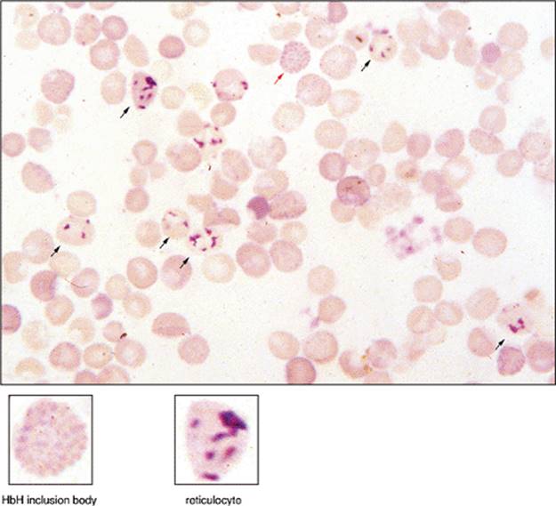 When three gene foci are defective, α-chain synthesis is substantially decreased, and excess β-chains form tetramers called HbH, which are soluble and do not precipitate in the marrow to cause damage of erythrocyte precursors. They are present in the circulating red cells, but precipitate as they age, forming inclusion bodies. The spleen, which enlarges in this disorder, prematurely destroys these cells, causing hemolytic anemia. This disease most commonly occurs in Asians, and the anemia is usually moderate, with hematocrits of 20 to 30. The blood smear shows substantial hypochromia, microcytosis, basophilic stippling, and polychromasia. Abnormal erythrocytes apparent on blood smear include target cells, teardrop cells, and nucleated and fragmented cells. Heinz-body preparations disclose precipitated HbH, visible as multiple small erythrocyte inclusions. On hemoglobin electrophoresis, about 3% to 30% of the total is HbH.