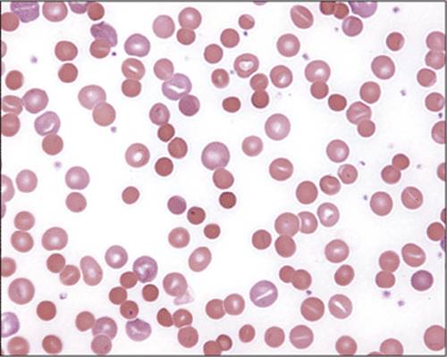 Figure 1.12 Thalassemia trait blood film. Peripheral blood films in β-thalassemia trait may demonstrate microcytosis and possibly hypochromasia. Multiple morphologic changes including target cells, teardrop cells, and rare fragments may occur. These features can appear identical to the morphologic picture of iron deficiency. Basophilic stippling can occur in Mediterranean populations with β-thalassemia trait and is less common in other populations with this disorder. Basophilic stippling may help distinguish β-thalassemia trait from iron deficiency, but is not always present in patients with β-thalassemia trait. Red blood cell indices may help: a normal or slightly decreased hemoglobin with a low MCV/MCH and a low or mildly increased RDW suggests thalassemia. Red blood cell indices may not always distinguish iron deficiency from thalassemia trait, however. Patients also may have combined iron deficiency and β-thalassemia trait and therefore require further testing to exclude the former. |
