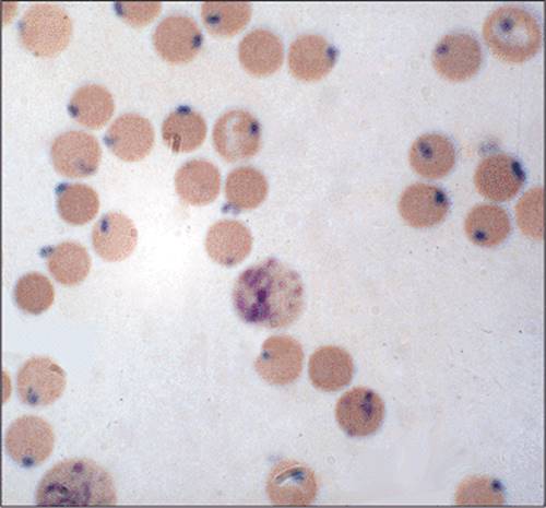 Figure 1.29 Pappenheimer bodies. Pappenheimer bodies are single or multiple blue, small, and angular inclusions within the erythrocyte. By contrast, Howell-Jolly bodies are usually single inclusions that are larger and round, not angular. Basophilic stippling is evenly distributed over the whole cell. Pappenheimer bodies are positive when stained for iron. |