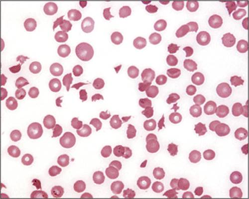 The anemia is normochromic, normocytic, and most red cells are unremarkable on the peripheral smear. Burr cells (echinocytes), however, may form via unknown mechanisms, and sometimes schistocytes appear.