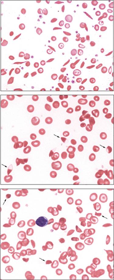 Figure 1.72 Sickle cell anemia. Top panel: Peripheral blood film of hemoglobin SS (HbS disease). The numerous elongated erythrocytes with sharp points are classic sickle cells. Sickle cells that appear folded over are called envelope cells. Target cells are present, in this case because of hyposplenism from the splenic infarction that occurs in HbSS patients. Howell-Jolly bodies may be seen as well. Middle panel: Peripheral blood film in patient with HbSS, demonstrating sickle cells with Hb concentrated at one end and absent at the other, called hemi-lunes (arrows), a finding seen in HbSS or HbSC. Bottom panel: Peripheral blood film in patient with HbSS, demonstrating short, stubby, and rhomboid-shaped sickle cells called oat and boat cells (arrows). |