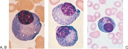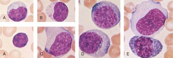 Often, transitional forms between lymphocytes and plasma cells are seen in the blood of patients with viral infections (Fig. 14.1C-E). These cells are variously known as lymphocytoid plasma cells or plasmacytoid lymphocytes. They obviously represent morphologic stages of differentiation of antigenically stimulated lymphocytes.