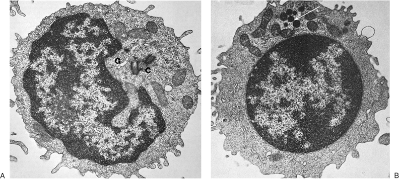 Figure 14.2. Ultrastructure of normal peripheral blood lymphocytes. A: A typical resting lymphocyte. The nucleus contains primarily heterochromatin in aggregates along the nuclear membrane. The nucleolus in lymphocytes is usually small. In the cytoplasm, the ribosomes are dispersed, but occasionally, a few short strands of rough endoplasmic reticulum are visible. The mitochondria are well developed and the centrioles (C), longitudinally sectioned in this illustration, show evidence that the cell is ready to enter mitosis on triggering. The Golgi apparatus (G) is small (×24,000). B: This lymphocyte contains granules (arrow) and is likely to correspond to the large granular lymphocyte variety. The cytoplasm is abundant and filled with ribosomes with a few strands of endoplasmic reticulum (×12,000). (From Zucker-Franklin D, Greaves MF, Grossi CF. Atlas of blood cells, 2nd ed. Philadelphia: Lea & Febiger, 1988, with permission.) |