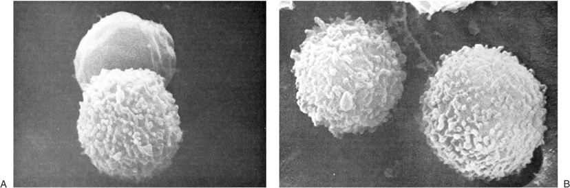 Figure 14.3. Heterogeneity of human lymphocytes by scanning electron microscope. A: A smooth and a villous lymphocyte, thought to correspond to that of T and B lymphocytes, respectively. The appearance of the lymphocytes, however, depends on the method of preparation; both lymphocytes are smooth when they rest in their microenvironments (×14,500). B: Two villous cells in a preparation depleted of T cells (×14,500). (From Zucker-Franklin D, Greaves MF, Grossi CF. Atlas of blood cells, 2nd ed. Philadelphia: Lea & Febiger, 1988, with permission.) |