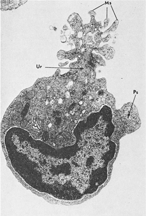 Figure 14.4. Lymphocyte locomotion. The lymphocyte assumes the characteristic hand-mirror configuration. The nucleus occupies the front, and part of the cytoplasm forms a tail or uropod (Ur), which displays an elaborate pattern of microspikes (Ms). A small pseudopod (Ps) on the side contains only ribosomes. (From Rosenstreich DI, Shevach E, Green I, et al. The uropod-bearing lymphocyte of the guinea pig. Evidence for thymic origin. J Exp Med 1972;135:1037, with permission.) |