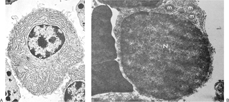 Figure 14.6. Electron micrographs of a plasma cell and an intermediate form. A: Typical plasma cell has cytoplasm filled with endoplasmic reticulum (×6,000). B: A lymphocytoid-plasma cell with scant amounts of cytoplasm filled with endoplasmic reticulum and a few mitochondria (m) (×9,900). N, nucleus. (From Maldonado JE, Kyle RA, Brown AL, et al. “Intermediate” cell types and mixed cell proliferation in multiple myeloma: electron microscopic observations. Blood 1966;27:212–226, with permission.) |