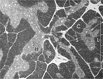 Figure 14.7. Histology of thymus shows lobules (L) consisting of cortex (C) and medulla (M). H, Hassall corpuscles; S, septa (trabeculae). |