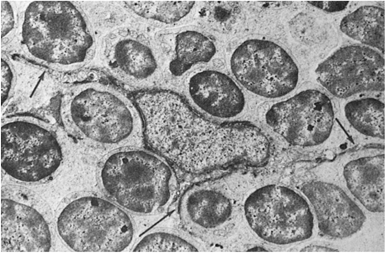 Figure 14.8. Ultrastructure of the thymus. An epithelial dendritic cell at center (E) extends long cytoplasmic processes (arrows). Note the intimate contact between the epithelial cell and the surrounding thymocytes (×4,400). (From Bloodworth JMB Jr, et al. Ultrastructure of the human thymus, thymic tumors, and myasthenia gravis. Pathol Annu 1975;10:329, with permission.) |