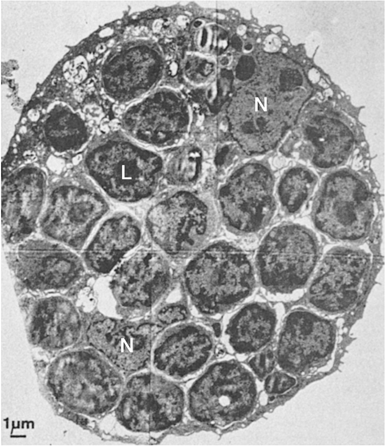 Figure 14.9. A typical large nurse cell containing many thymocytes (L) and two epithelial nuclei (N). Between the internalized thymocytes are cytoplasmic vesicles and tonofilaments. Some nurse cells contain thymocytes in mitosis. (From Wekerle H, Ketelsen UP, Ernst M. Thymic nurse cells. Lymphoepithelial cell complexes in murine thymuses: morphological and serological characterization. J Exp Med 1980;151:925, with permission.) |