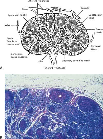 The ontogeny of the secondary lymphoid organs, LNs, PPs, and spleen, is highly complex (105,106,107). The fundamental concepts of lymphoid organ neogenesis were generated approximately 100 years ago (108). The first stage in the development of the LN and PP is the budding from large vessels of lymph sacs, which are then penetrated by connective tissue and lymphatic vessels. These vessels interconnect with other vessels, forming a network. The Prox-1 gene is expressed on lymphatic endothelial cells and is required for budding and sprouting of the lymphatic endothelium (109). Sabin (108) observed that one spot of budding to generate a lymph sac occurs in the anterior cardinal veins of the neck. This lymph sac gives rise to the lymphatics of the neck, thorax, heart, lungs, and forelegs. In the same location, the expression of the Prox-1 gene was identified. After the development of the lymphatics, circulating CD45+/CD4+/CD3- hematopoietic, progenitor cells from liver provide the signals for induction of LNs and PPs. Lymphotoxin (LT) is essential for the formation of LNs and PPs, as shown in LTα-/- mice in which there is a profound defect in the formation of LN, complete absence of PP, and grossly disturbed splenic microarchitecture. The membrane form of LT is the active signaling molecule in LN and PP biogenesis (110). LTα forms heterotrimers with LTβ (LTα1β2) and exists as a membrane-bound form on the cell surface. LTα1β2does not bind to either of the two tumor necrosis factor (TNF) receptors but to its own receptor, the LTβ receptor (LTβR) (111). LTα1β2 binds to its own receptor, LTβR, and results in the induction of the nuclear factor–κB (NF-κB)inducing kinase (NIK), initiating an alternative pathway for activation of the transcription factor NF-κB, which plays a pivotal role in innate and adaptive immunity (112). This alternative pathway (i.e., LTα1β2 → LTβR → NIK → inhibitory κ-B kinase) (IKKα) constitutes a major pathway in the development, organization, and function of the secondary lymphoid organs. The chemokines CCL19, CCL21 (which bind to chemokine receptor CCR7), and CXCL13 (which binds to receptor CXCR5) are also important for the colonization of lymphoid organs by T and B cells and antigen-presenting cells (113).