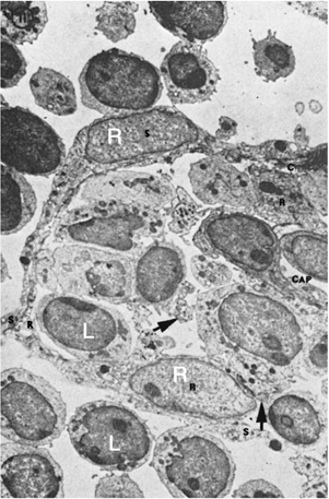 The thymocyte–epithelial cell interaction in the outer cortex results in the formation of lymphoepithelial complexes known as nurse cells (Fig. 14.9) (82). They are composed of large clusters of lymphocytes surrounded by cell membrane and appear to reside within the cell body of an epithelial cell. Their significance in T-cell differentiation is discussed in Chapter 16. The epithelial cells of the medulla do not have long dendritic processes and are known as epithelioid or spatulate epithelial cells. They are more pleomorphic and contain dark granular inclusions that may have secretory functions. Another variety of epithelial cells, known as squamoid, is found exclusively in the medulla. These cells probably give rise to Hassall corpuscles and contain dense bundles of tonofilaments and masses of keratohyalin.