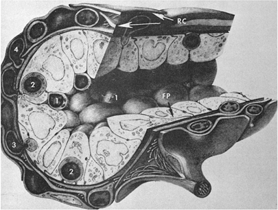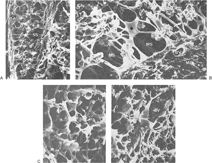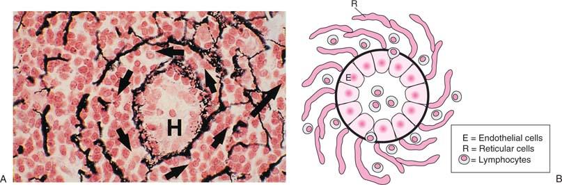The thymic anlage initially is avascular. Vessels penetrate the thymus at approximately 12 to 14 weeks of gestation. The thymic arteries, which are branches of the inferior thyroid, internal mammary, and pericardial phrenic arteries, enter the thymus from the surrounding tissues, pass down to the medulla, and branch into arterioles that penetrate into the deep cortex. Capillaries that arise from the arterioles run toward the subcapsular cortex, where they anastomose and turn inward toward the medulla, eventually forming venules (93). The vessels are ensheathed with epithelial cells and connective tissue that is continuous with the capsule. Histologically, therefore, a number of layers can be distinguished from the lumen of the blood vessels outward: Endothelium; the vascular basement membrane; a mesenchymal perivascular connective tissue space occupied by collagen fibers, fibroblasts, some macrophages, and other cells; an epithelial basement membrane; and the epithelial cell syncytium. These layers constitute the blood–thymus barrier. The mesenchymal interstitial space is probably formed in the early stages of development when the thymic epithelial cells envelop the blood vessels. This space is considered extraparenchymal. The tightness of the barrier has been tested with particulate and protein tracers. It is tight in the cortex, mainly because of the impermeability of the endothelial junctions. Traces of protein transported by plasmalemmal vesicles of the endothelial cells and released on the parenchymal front are removed rapidly by the macrophages along the vessels in the interstitial space and thereby are prevented from coming into contact with the thymocytes. The barrier is incomplete in the medulla, however, especially along the site of thymocyte migration through the wall of venules (94). The fact that antigens can be detected in the thymus indicates that the “barrier” has leaks (95). Nevertheless, experimental tracers never reach the cortical parenchyma. This arrangement of the vasculature and epithelial sheaths separates the thymus into the intraparenchymal compartment, composed of the lymphoepithelial complex, and the extraparenchymal compartment, composed of the blood vessels and the surrounding interstitial space.