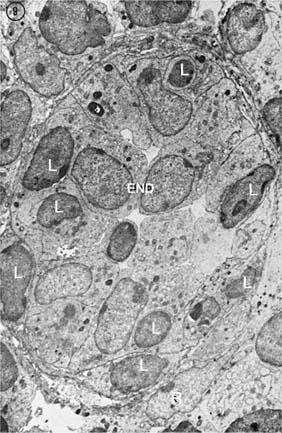 Ultrastructurally, the epithelial cells are phenotypically highly heterogeneous, probably reflecting their divergent origins (see Chapter 16). In the past, the epithelial cells have been referred to by a variety of designations, such as reticular, syncytial, epithelioid, and squamoid (Fig. 14.8). The characteristic features that distinguish them from other cells in the thymic parenchyma are the presence of tonofilaments and desmosomes. The tonofilaments are filamentous structures approximately 3.0 nm in diameter and 0.1 to 3.0 μm in length. They often form bundles and are located close to the nucleus. Desmosomes are detected at the junctions of the dendritic processes of adjacent epithelial cells. Their oval nuclei have evenly distributed chromatin and prominent nucleoli. The epithelial cells joined by desmosomes form a continuous meshwork that surrounds the trabeculae, the blood vessels, and the inner surface of the capsule. Between the epithelial sheath and the supporting scaffolding of the trabeculae and blood vessels is a continuous basement membrane distinct from the basement membrane of the capillaries. The epithelial meshwork thus separates cavernous spaces filled with thymocytes.