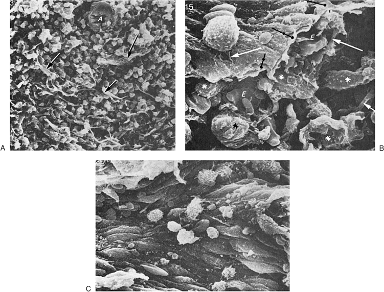 Lymphocyte locomotion was described vividly by Lewis (22), who observed that the cell first extends a pseudopod separated from the rest of the cell by a groove that encircles the cell body. Eventually, as the groove deepens, the nucleus is pushed forward through the constriction ring, giving rise to the classic shape of the motile lymphocyte, resembling a hand mirror or pear. The advancing front is occupied by the nucleus, which is separated by a deep constriction from the rest of the cytoplasm that trails behind, forming the handle of the mirror. The cytoplasmic tail is called the uropod (from Greek ura, “tail,” and podi, “foot”) (Fig. 14.4) (23). It is studded with microvilli and microspikes, which vary in width from 12.5 to 200 nm and to as much as 0.8 μm in length. The motile lymphocyte moves with an average speed of 20 μm/minute. In general, motility increases with the state of cell activation as lymphoblasts demonstrate greater locomotion than small lymphocytes. It could therefore be stated that locomotion is enhanced by stimuli inducing blast transformation. The uropod not only is associated with locomotion, but also serves as a site for a variety of interactions with lymphocytes, macrophages, and other cells (24). In mixed lymphocyte cultures, lymphocytes may approach macrophages and then turn around to establish contacts with them through their uropods. The locomotion of lymphocytes around macrophages has been called peripolesis to distinguish it from emperipolesis (“inside roundabout wandering”), which describes the penetration of malignant cells by lymphocytes. T lymphocytes also adhere to macrophages by means of uropods, forming clusters or rosettes (25). A stable cluster forms only when macrophages and lymphocytes are exposed to antigen. The T lymphocytes within clusters are stimulated into proliferative activity. In general, uropod formation is a morphologic expression of lymphocyte activation as measured by DNA synthesis.
