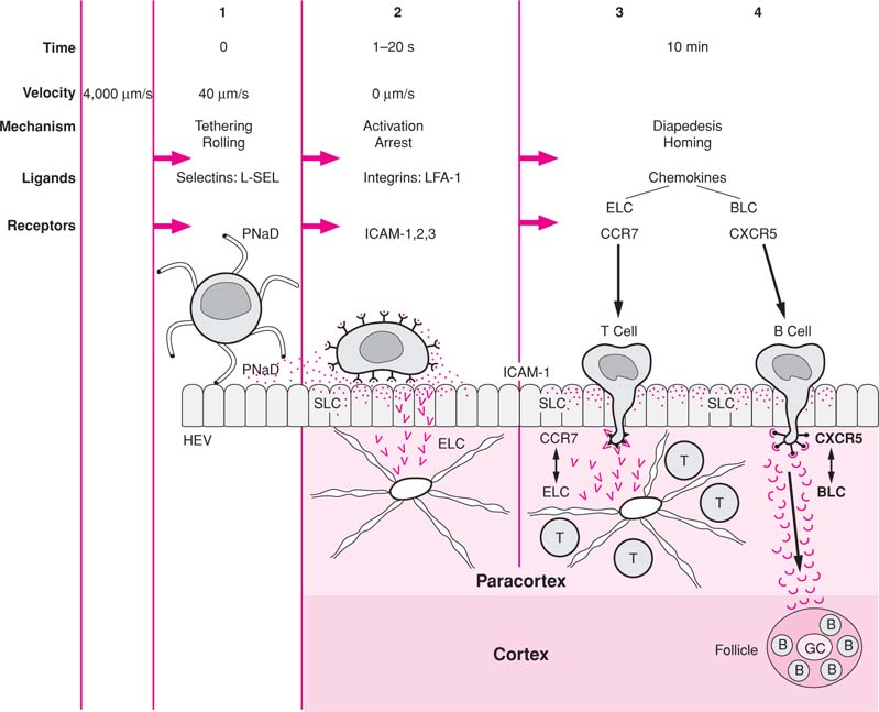 Development of B-cell–rich lymphoid follicles requires the function of the B-lymphocyte chemoattractant (BLC) or CXCL13 and its receptor CXCR5, which stimulates homing of B lymphocytes to the follicles. BLC induces up-regulation of α1β2 LT, which promotes follicular DC development and BLC expression, establishing a positive feedback loop (122). Colonization of the paracortical areas by T cells is regulated by another chemokine system (see Lymphocyte Homing and Recirculation).