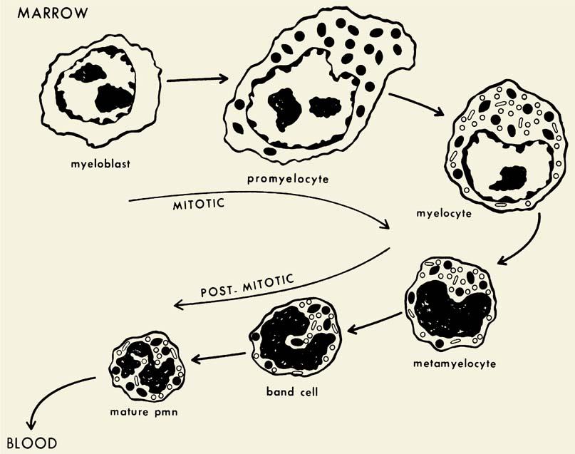Figure 9.1. Appearance of granules during neutrophil maturation. Myeloblasts are undifferentiated cells with a large oval nucleus, large nucleoli, and cytoplasm lacking granules. They originate from a precursor pool of stem cells. Subsequently, there are two stages—the promyelocyte and the myelocyte—each of which produces a distinct type of secretory granule: azurophils (dark granules) are produced only during the promyelocyte stage; specific granules (light granules) are produced during the myelocyte stage. The metamyelocyte and band forms are nonproliferating stages that develop into the mature polymorphonuclear neutrophil characterized by a multilobulated nucleus and cytoplasm containing primarily glycogen and granules. Both nonspecific azurophilic granules and specific granules persist throughout these later stages. (Modified from Bainton DF, et al. The development of neutrophilic PMN leukocytes in human bone marrow: origin and content of azurophil and specific granules. J Exp Med 1971;134:907.) |