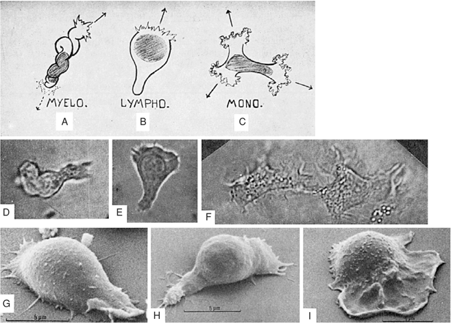 Figure 9.3. Diagrams (A, B, C), photographs (D, E, F), and scanning electron micrographs (G, H, I) of living, moving, unstained blasts. The photographs are of cells enlarged (×1,000) from negatives of motion picture films of tissue cultures. A: Wormlike shape of myeloblast (myelo.) in motion. B: Hand-mirror shape of lymphoblast (lympho.) in motion. C: Shape of monocyte (mono.) (histiocyte) in motion. D: Myeloblast from the blood of a patient with acute myeloblastic leukemia. E: Lymphoblast from the blood of a patient with acute lymphoblastic leukemia. F: Two monocytes from normal blood. G: Human leukemic myeloblast. H: Human leukemic lymphoblast. I: Human leukemic monoblast. (Photographs used with permission from Rich AR, et al. The differentiation of myeloblasts from lymphoblasts by their manner of locomotion. Bull Johns Hopkins Hosp 1939;65:291; and electron micrographs used with permission from Senda N. The movement of leucocytes. J Clin Electron Microsc 1974;7:3.) |