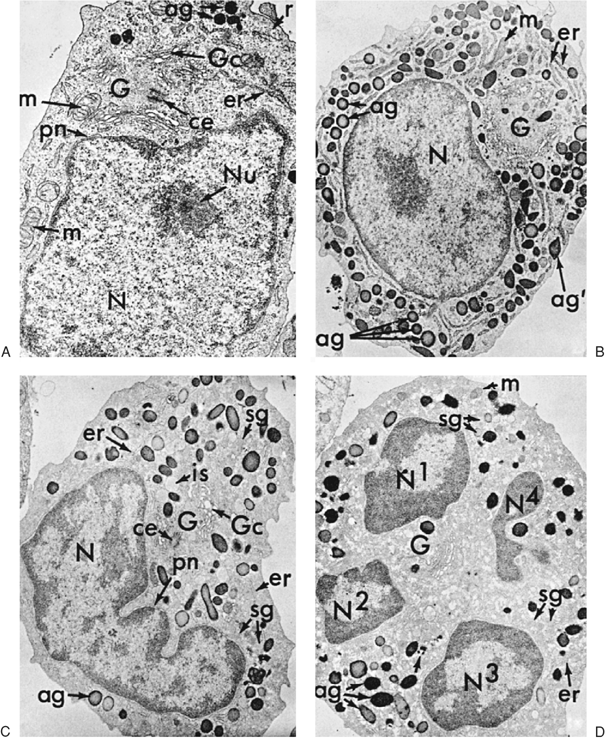 Figure 9.6. Early and late promyelocytes, a myelocyte, and a polymorphonuclear neutrophil (PMN) viewed by electron microscopy. (Courtesy of Bainton D, University of California, San Francisco.) A: Early neutrophilic promyelocyte (reacted for peroxidase, 10,500). The nucleus (N) with its prominent nucleolus (Nu) occupies the bulk of this immature cell. The surrounding cytoplasm contains a few azurophil granules (ag), a large Golgi complex (G), Golgi cisternae (Gc), several mitochondria (m), scanty rough endoplasmic reticulum (er), and many free polysomes (r). A centriole (ce) is present in the Golgi region. All of the azurophil granules (ag) appear dense because they are strongly reactive for peroxidase. The secretory apparatus, i.e., the perinuclear cisterna (pn), rough endoplasmic reticulum (er), and Golgi cisternae (Gc), are also reactive, although less so than the granules. Specimen was fixed in glutaraldehyde for 16 hours at 4°C, incubated in the peroxidase medium of Graham and Karnovsky for 1 hour at 22°C, postfixed in osmium tetroxide, treated in block with uranyl acetate, dehydrated in ethanol, infiltrated with propylene oxide, and embedded in Araldite. Section stained for 1 minute with lead citrate. B:Late neutrophilic promyelocyte (reacted for peroxidase, 7,000). This cell is the largest (15 μm) of the neutrophilic series. It has a sizable, slightly indented nucleus (N), a prominent Golgi region (G), and cytoplasm packed with peroxidase- positive azurophil granules (ag). Note the two general shapes of the azurophil granules: spherical (ag) and ellipsoid (ag′). Most are spherical, with a homogeneous matrix, but a few ellipsoid forms containing crystalloids also are present. Many of the spherical forms (ag) have a dense periphery and a lighter core, presumably because of incomplete penetration of substrate into the compact centers of mature granules. Peroxidase reaction product is visible (under higher magnification) in less concentrated form within all compartments of the secretory apparatus (endoplasmic reticulum, perinuclear cisterna, and Golgi cisternae). No reaction product is seen in the cytoplasmic matrix, mitochondria, or nucleus. Specimen was fixed in glutaraldehyde for 10 minutes at 4°C and subsequently processed exactly as was the specimen in A. C: Neutrophilic myelocyte (reacted for peroxidase, 9,000). At this stage, the cell is smaller (10 μm) than the promyelocyte, the nucleus is more indented, and the cytoplasm contains two different types of granules: large, peroxidase-positive azurophils (ag) and the generally smaller, specific granules (sg), which do not stain for peroxidase. A number of immature specific granules (is), which are larger, less compact, and more irregular in contour than mature granules, are seen in the Golgi region (G). Note that peroxidase reaction product is present only in azurophil granules and is not seen in the rough endoplasmic reticulum (er), perinuclear cisterna (pn), and Golgi cisternae (Gc), in keeping with the fact that azurophil production has ceased, and only peroxidase-negative specific granules are produced during the myelocyte stage. D: Mature PMN (reacted for peroxidase, 10,500). The cytoplasm is filled with granules; the smaller peroxidase-negative specific granules (sg) are more numerous, the azurophils (ag) having been reduced in number by cell divisions after the promyelocyte stage. Some small, irregularly shaped azurophil granule variants are also present (unlabeled arrow). The nucleus is condensed and lobulated (N1–N4), the Golgi region (G) is small and lacks forming granules, the endoplasmic reticulum (er) is scanty, and mitochondria (m) are few. Note that the cytoplasm of this cell has a rather ragged, moth-eaten appearance because the glycogen, which is normally present, has been extracted in this preparation by staining in block with uranyl acetate. |
