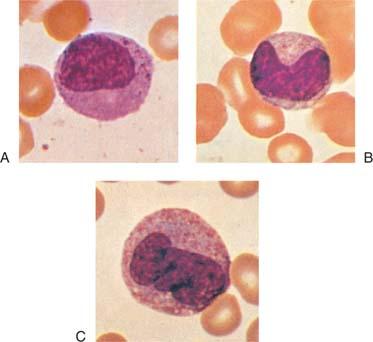 Figure 9.8. A: Late myelocyte or early metamyelocyte. B: Metamyelocyte. C: Monocyte (×1,000, Wright stain). |