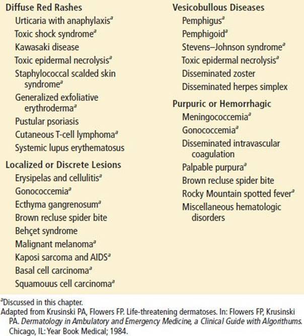 Cutaneous lesions are often the first clinical sign of serious systemic disease. In this chapter, the focus is on the recognition and acute management of the common life-threatening dermatoses listed in Table 170.1. These disorders can be conveniently grouped into diffuse red rashes, vesiculobullous eruptions, localized or discrete lesions, and purpuric or hemorrhagic lesions (Table 170.2). The following dermatologic findings should alert clinicians to a potentially serious eruption (1):