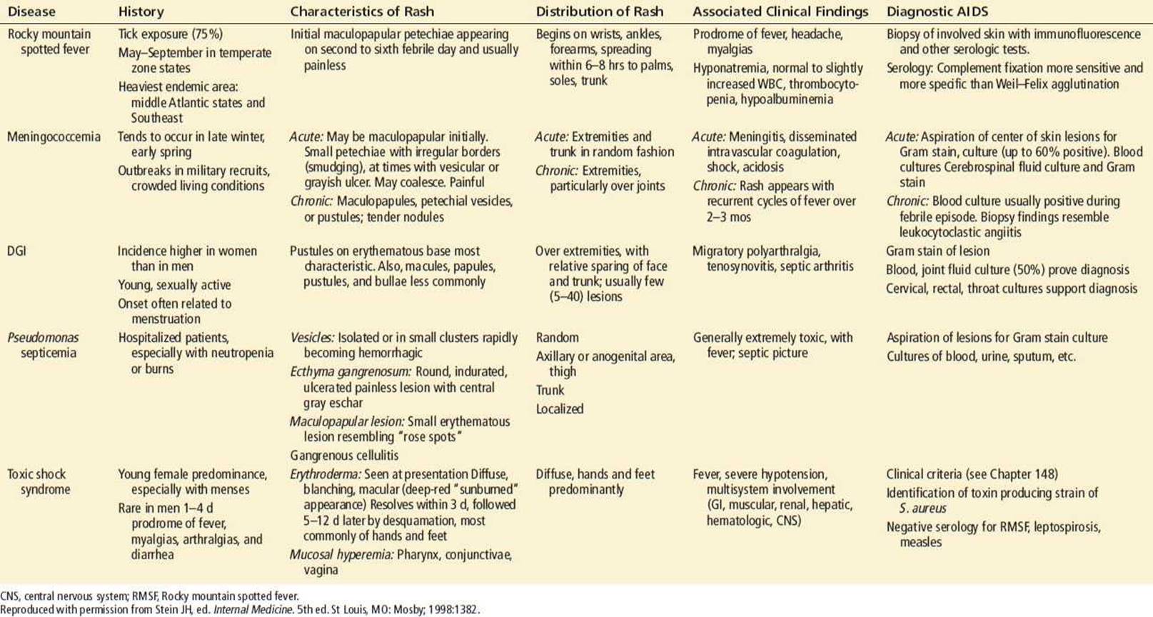 The differential diagnosis of RMSF includes TSS, meningococcal meningitis, Kawasaki disease, measles, leptospirosis, Colorado tick fever, enteroviral infections, any cause of disseminated intravascular coagulation and vasculitis, mononucleosis, rat-bite fever, atypical measles, and other rickettsial diseases. Among the latter are murine typhus and epidemic typhus, which both have rashes that usually begin on the trunk rather than on the distal extremities.