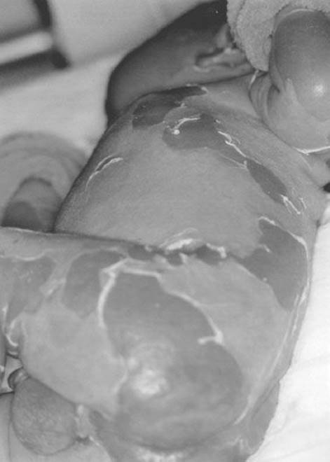 FIGURE 170.1 Staphylococcal scalded skin syndrome. A 10-day-old Caucasian boy with staphylococcal scalded skin syndrome. He was treated with fluids, oral dicloxacillin, and wound care. His skin healed completely and without scarring within 2 weeks of this photograph being taken. (From Avery GB, Fletcher MA, MacDonald MG. Neonatology: Pathophysiology and Management of the Newborn. 5th ed. Philadelphia, PA: Lippincott Williams & Wilkins; 1999:1199, with permission.)