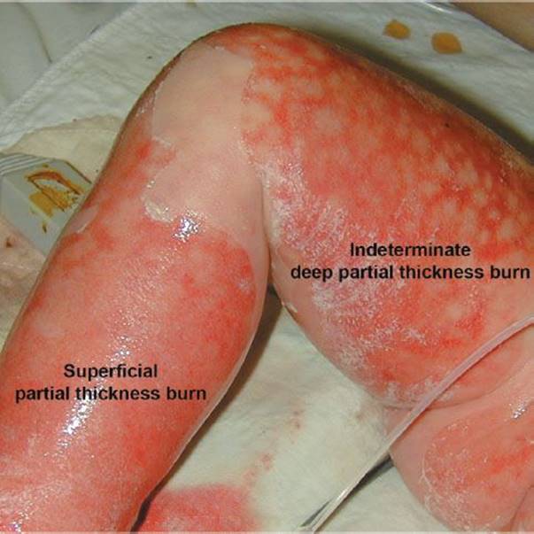 FIGURE 170.2 Toxic epidermal necrolysis that may extend into the reticular dermis (deep partial thickness) or the papillary dermis (superficial partial thickness). The peripheral zone of hyperemia correlates with a superficial or first-degree burn and might be similar to a sunburn. (From Mulholland MW, Lillemoe KD, Doherty GM, et al. Greenfield’s Surgery Scientific Principles and Practice. 4th ed. Philadelphia, PA: Lippincott Williams & Wilkins; 2006.)