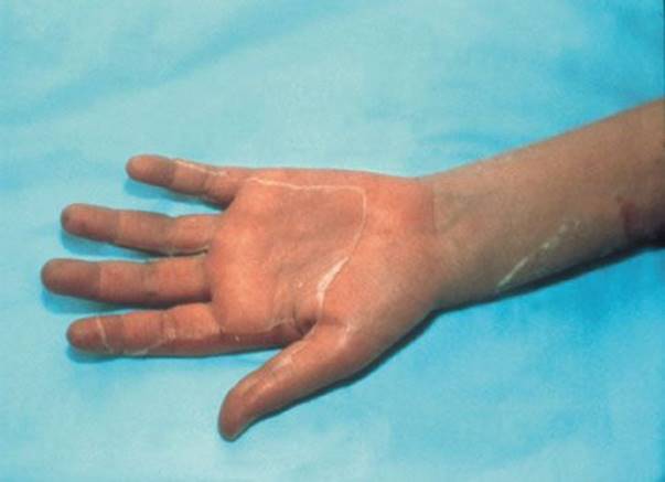 FIGURE 170.3 Toxic shock syndrome. Desquamation of the skin of the palm in a patient with staphylococcal toxic shock syndrome. (From Sweet RL, Gibbs RS. Atlas of Infectious Diseases of the Female Genital Tract. Philadelphia, PA: Lippincott Williams & Wilkins; 2005, figures 9–2.)