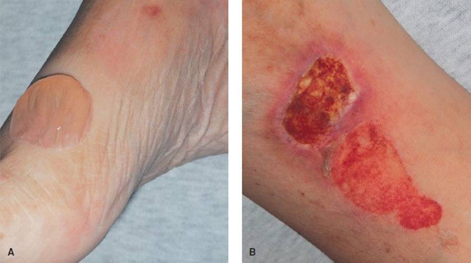 FIGURE 170.5 Pemphigus vulgaris. A: Bulla. B: Erosion. (From Berg D, Worzala K. Atlas of Adult Physical Diagnosis. Philadelphia, PA: Lippincott Williams & Wilkins, 2006.)