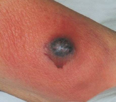 The appearance of the lesion can vary, depending on the stage of the illness at presentation. Beginning as a painless macule or vesicle, it indurates and assumes the appearance of a pustule or bulla on a blue or red base. The lesion then sloughs, leaving a gangrenous ulcer, usually several centimeters in size. These solitary or multiple lesions usually occur mainly in the perineal region or on the extremities.