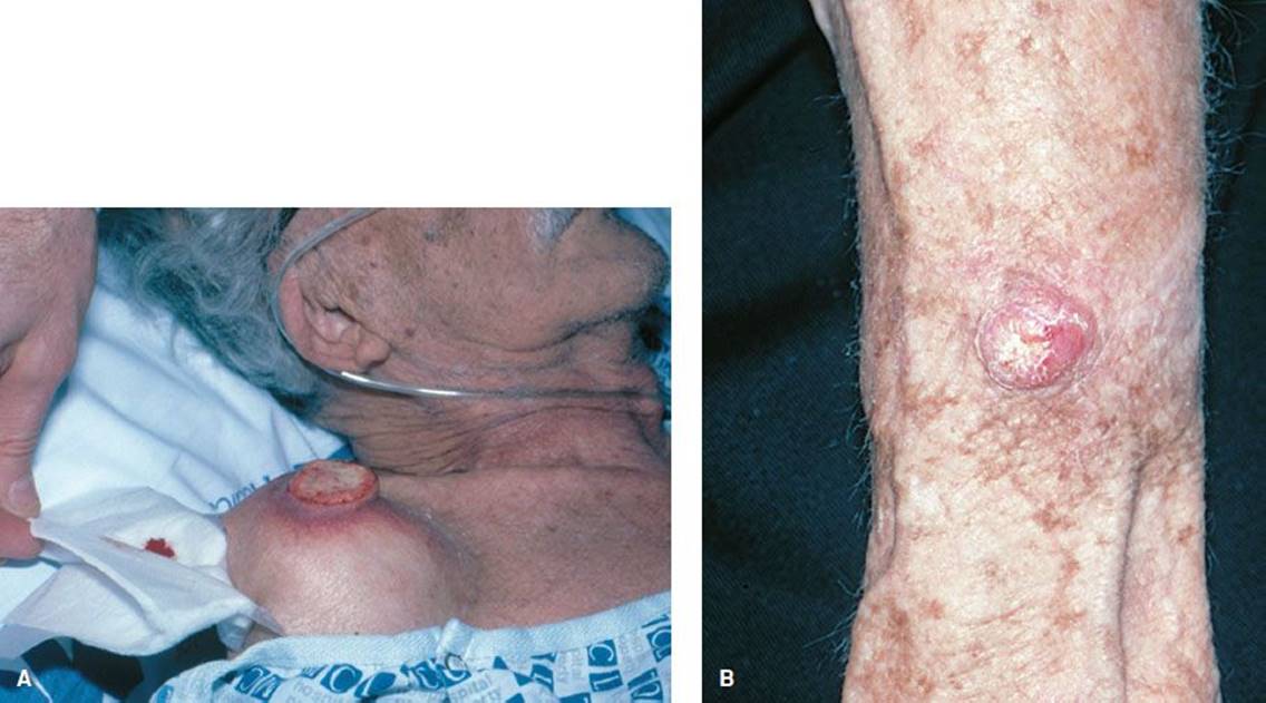 FIGURE 170.11 Squamous cell carcinoma. A: This neglected tumor has ulcerated. B: This reddish nodule is indistinguishable from BCC. (From Goodheart HP. Goodheart’s Photoguide of Common Skin Disorders. 2nd ed. Philadelphia, PA: Lippincott Williams & Wilkins; 2003.)