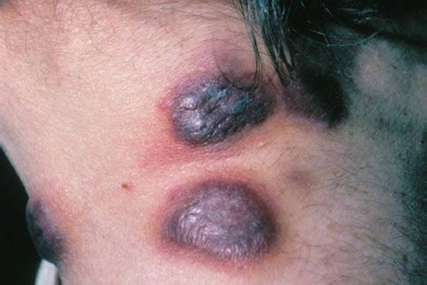 It appears as red, purple, or brown papules or plaques, solitary or multiple, on skin or mucous membrane. Internal organs may be involved as well, including the gastrointestinal (GI) tract and lungs. Diagnosis is made by clinical appearance in the appropriate individual. Management focuses on controlling the underlying disease.