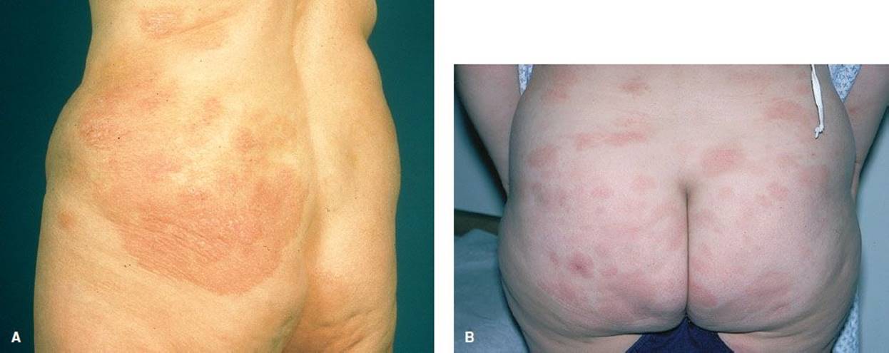 FIGURE 170.14 Mycosis fungoides. A: A 66-year-old woman presented with a 30-year history of erythematous scaly patches and plaques with telangiectases, atrophy, and pigmentation. (From Elder AD, Elenitsas R, Johnson BL, et al. Synopsis and Atlas of Lever’s Histopathology of the Skin. Philadelphia, PA: Lippincott Williams & Wilkins; 1999, p 2, clin. fig. IA1; p 163, clin. fig. IVE3; p 167,.) B: Lesions have characteristic “smudgy,” poorly defined patches and plaques in a typical location. (From Goodheart HP. Goodheart’s Photoguide of Common Skin Disorders. 2nd ed. Philadelphia, PA: Lippincott Williams & Wilkins; 2003.)