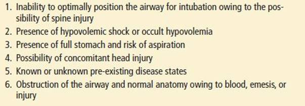 There are many special considerations to take into account when faced with controlling and maintaining an adequate airway in the trauma patient; some are listed in Table 19.1. The EP should assume the presence of cervical spine injury in most victims of blunt trauma. Owing to the common occurrence of altered mental status and hemodynamic instability, as well as the difficulty of rapidly obtaining adequate cervical spine imaging, cervical spine injury cannot typically be excluded in many trauma patients who require emergent intubation.