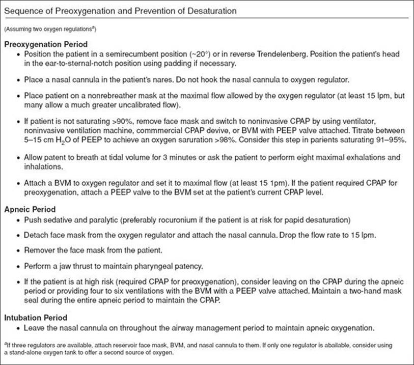 Preoxygenation is performed to maintain hemoglobin saturation during airway management. Desaturations below 70% put patients at risk for dysrhythmia, hemodynamic decompensation, hypoxic brain injury, and death. Preoxygenation is achieved either actively or passively. A logistic flow of preoxygenation to prevent desaturation is shown in eFigure 19.1 (7).