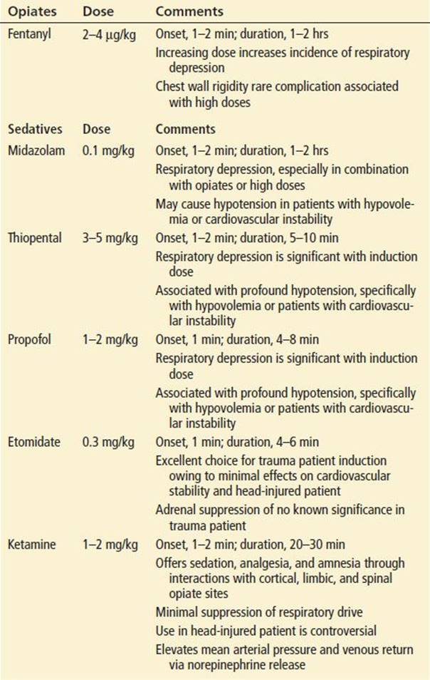 Sedatives, hypnotics, and potent opioid analgesics may be used as pharmacologic adjuncts to achieve states ranging from light sedation to complete loss of consciousness (Table 19.2). There is a balance between the risks and potential benefits for each of these agents in the trauma setting. The hemodynamic effects of each agent should be a primary consideration. Additional considerations include the following factors: (a) the agent’s reliability of induction at a given dose, (b) the need to maintain spontaneous respiration, (c) the likelihood of a traumatic brain injury, and (d) the patient’s pre-existing physiologic state including comorbidities.