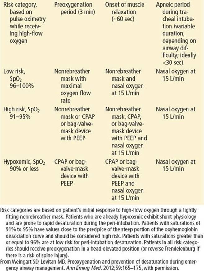 eFIGURE 19.1 Logistic flow of preoxygenation and prevention of desaturation. (From Weingart SD, Levitan MD. Preoxygenation and prevention of desaturation during emergency airway management. Ann Emerg Med. 2012;59:165–175, with permission.)