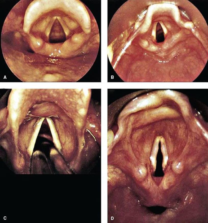 eFIGURE 19.2 Larynx appearance with videolaryngoscope. A: Preintubation view of an adult airway. B: Preintubation view of a pediatric airway. C: ETT passing between the vocal cords. D: The larynx and hypopharynx (note the horizontally oriented space below the laryngeal inlet, which is the esophagus). (From Nagdev A. Airway, breathing, circulation: Normal airway. In: Greenberg MI, Hendrickson RG, Silverberg M, et al., eds. Greenberg’s Text-atlas of Emergency Medicine. Philadelphia, PA: Lippincott Williams & Wilkins; 2004, with permission.)