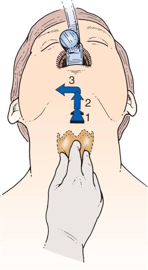 eFIGURE 19.3 Diagram of application of the BURP maneuver to improve the glottic view during laryngoscopy. The thyroid cartilage is moved Backward against the cervical vertebrae, Upward or as superiorly as possible, and laterally to the Right.