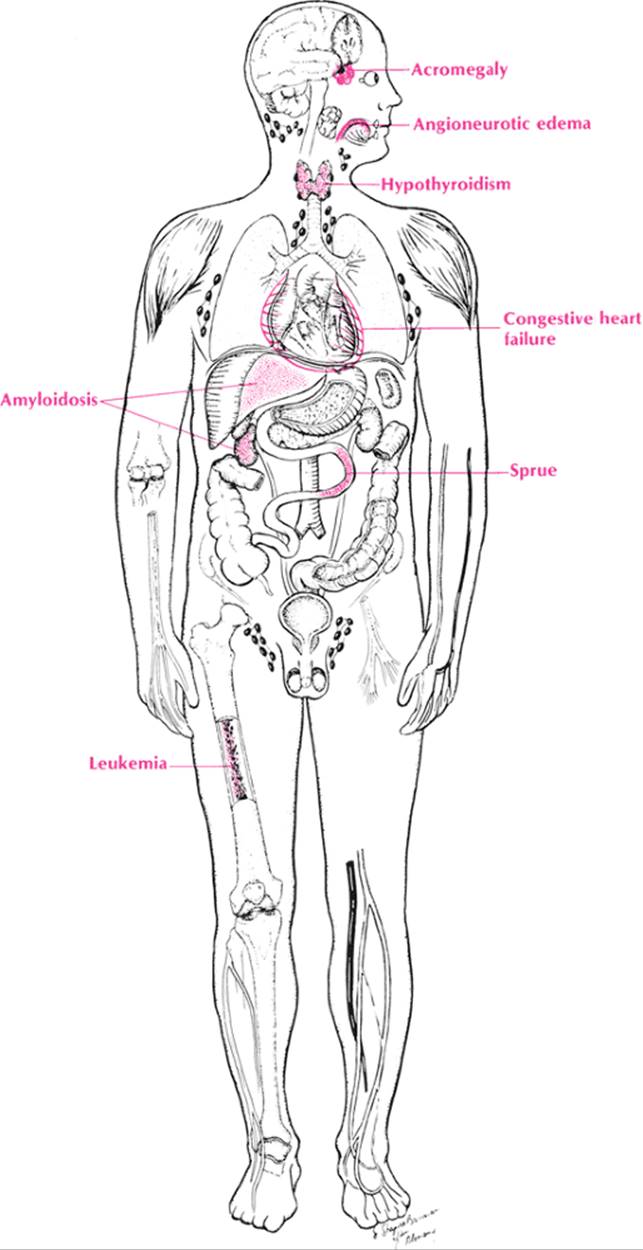 The mucosa can increase the number of cells in carcinoma of the tongue. It is swollen with a serous fluid in reaction to things put in the mouth such as hot food, mercury, and aspirin. Other less-well-understood sources of fluid in the mucosa are erythema multiforme and pemphigus. The submucosal and supporting tissue may be enlarged by serous fluid in angioneurotic edema, by purulent fluid in acute diffuse glossitis (usually caused by Streptococcusorganisms), or by hemorrhagic fluid in leukemia, scurvy, and other hemorrhage disorders. The subcutaneous and supporting tissue can also be infiltrated by a mucoprotein in myxedema and cretinism and by amyloid in primary amyloidosis. There may be infiltration of neoplastic cells in leukemia and lymphoma.
