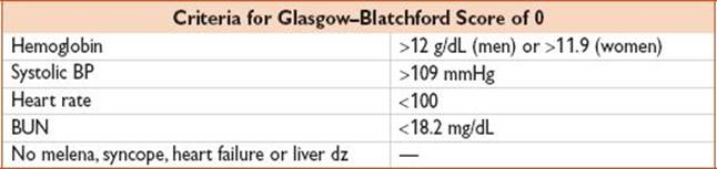• Glasgow–Blatchford score was designed to predict need for transfusion or urgent endoscopy. A score of zero identifies low-risk pts who can safely be discharged w/ outpt f/u (JAMA 2012;307(10):1072; Lancet2000;356(9238):1318).