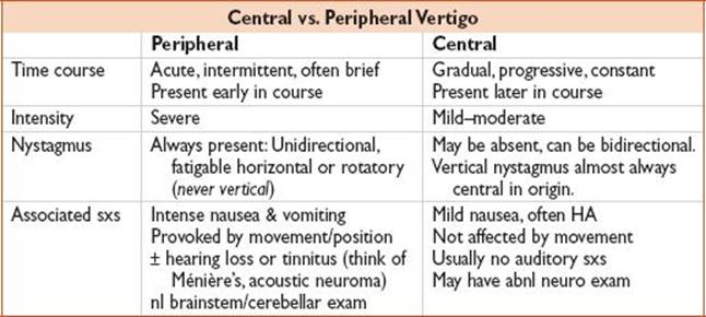 • RFs for central vertigo: Older age, males, HTN, CAD, DM, AF, h/o CVA/TIA
