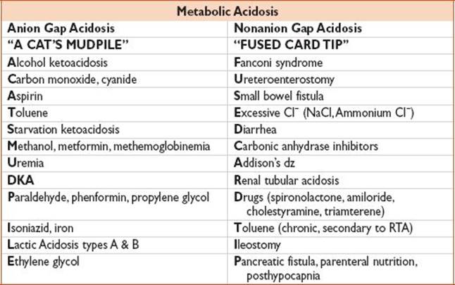 Anion gap acidosis: (Na – (Cl + bicarb)) > 14 (see chart)